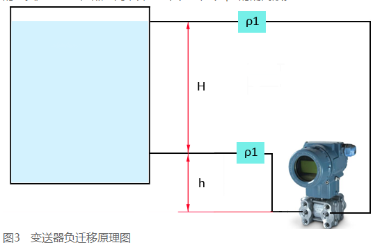 如圖3所示為負遷移的原理圖,如果差壓變送器的取壓室在運用過程中,密閉容器內的液體或者是氣體注入到取壓室中,那么測量管線就將會遭受很大程度的損害,甚至會遭受嚴重的腐蝕,為了密閉容器內的液體或者氣體流竄。因此,將隔離罐分別安裝到了差壓變送器的正負壓室與取壓點之間,并且注入了密度為ρ1的隔離液。