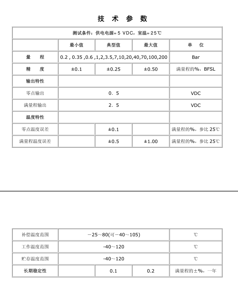 國(guó)產(chǎn)壓力變送器是將充油擴(kuò)散硅壓力傳感器芯體,通過(guò)激光焊接方式,裝入特定螺紋的壓力接口中組成。所有產(chǎn)品經(jīng)嚴(yán)格測(cè)試和篩選,利用MAX1452專用芯片進(jìn)行溫度補(bǔ)償和非線性校正,典型精度為0.25%,最高精度優(yōu)于0.1%,并保證在-25到80度工作溫區(qū)(最大可在-40到105度),全溫區(qū)測(cè)量精度在1%以內(nèi),5V供電,輸出0.5-2.5V電壓信號(hào),適用于各種不同壓力測(cè)量產(chǎn)品的組裝和生產(chǎn)。