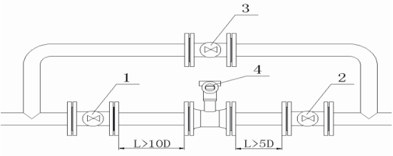 不允許直接在流量計(jì)測量管前后端安裝閥門、彎頭等極大改變流體流態(tài)的部件,如果需要在流量計(jì)前后管道上安裝閥門、彎頭等部件也應(yīng)盡量保證前后直管段長度,直管段要求前10D,后5D,對(duì)于新完工的工藝管道,應(yīng)先進(jìn)行初步吹掃后再安裝流量計(jì)。