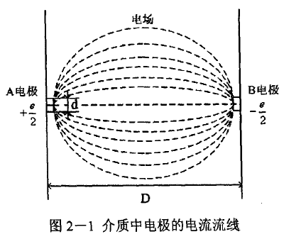 對(duì)于點(diǎn)電極的電磁流量計(jì)流量信號(hào)內(nèi)阻來說,如圖2-1所示,在絕緣襯里的傳感器測(cè)量管內(nèi)壁,裝有一對(duì)接液電極.電極是圓盤狀,直徑為d,電極A和電極B的距離(測(cè)量管直徑)為D(d<<D)。充滿導(dǎo)電液體的管道足夠長(zhǎng),電極所處介質(zhì)的電導(dǎo)率s和介電常數(shù)e是均質(zhì)的,對(duì)介質(zhì)內(nèi)的電流場(chǎng)不致有所改變。在這些假定條件下,電極實(shí)際上等于埋在各個(gè)方向具有無限深層的介質(zhì)內(nèi)。設(shè)兩電極間的電動(dòng)勢(shì)為e,A電極的電位為+e/2,B電極的電位為-e/2。從圖2-1可以看出,電流由A電極向介質(zhì)散流匯集于B電極流出。電流流動(dòng)時(shí)流過的截面在電極附近最小,以后離電極愈遠(yuǎn)愈大。也就是說離電極愈遠(yuǎn)電流密度愈小,因而電場(chǎng)強(qiáng)度也愈小。由此可見,在電流經(jīng)過的途徑每單位長(zhǎng)度上,介質(zhì)對(duì)電流的電阻愈遠(yuǎn)愈小.這樣,在計(jì)算傳感器信號(hào)內(nèi)阻時(shí),可以暫把流體的體電阻視為零,僅計(jì)算兩電極與介質(zhì)相接觸的接觸電阻。