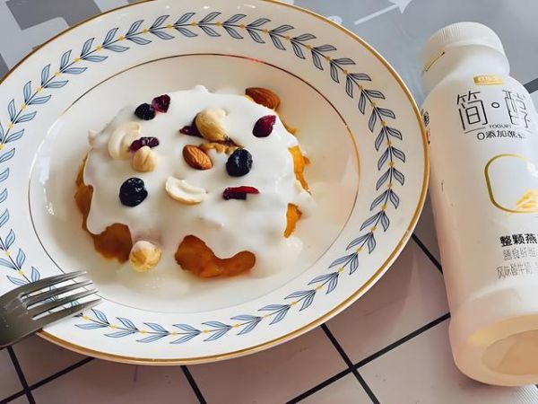 3. 塑型壓實(shí)后,將酸奶淋在紅薯泥上即可。