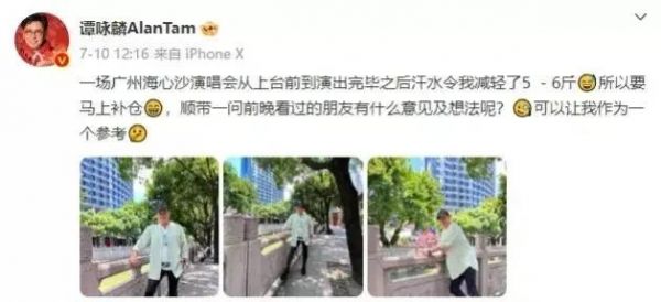 第二天,他發(fā)文透露自己在演唱會(huì)結(jié)束后,因?yàn)榱骱顾萘?到6斤。當(dāng)時(shí)他還稱要馬上補(bǔ)充能量,去吃好吃的。