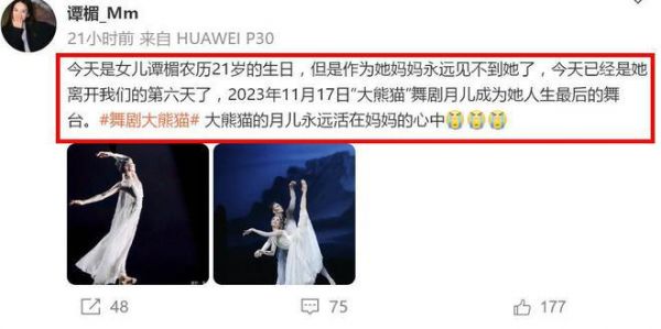 23日,譚楣的媽媽在譚楣賬號(hào)上悼念閨女,稱當(dāng)天是譚楣21歲生日,但作為她的媽媽卻見(jiàn)不著他了,由于譚楣在6天前就已經(jīng)離開(kāi)人世。2023年11月17日,譚楣在“熊貓”歌舞劇的月亮一角,成為她最后的舞臺(tái)。