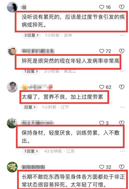 針對(duì)譚楣的去世原因,有網(wǎng)友還猜測(cè)譚楣是不是過(guò)度勞累加上營(yíng)養(yǎng)不良導(dǎo)致,畢竟舞蹈演員對(duì)自己的身材有嚴(yán)苛要求,通常需要控制飲食,必要時(shí)甚至節(jié)食瘦身,在此情況下加上平日訓(xùn)練強(qiáng)度超標(biāo)導(dǎo)致身體透支,最終很容易誘發(fā)身體疾病,譚楣或許就是這樣離開(kāi)的。正如譚楣生前所言:“舞臺(tái)是我生命的一部分,盡管短暫,但我用盡全力。”她的離世喚起對(duì)藝術(shù)家生活的反思。