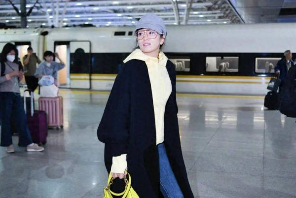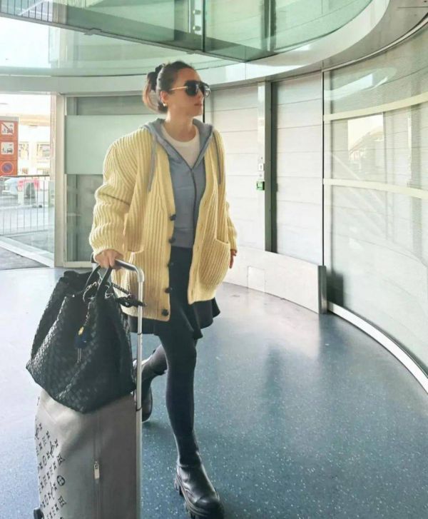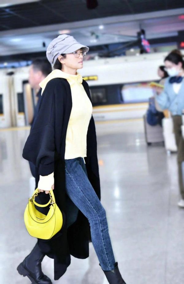 她選擇了一件溫暖的黃色衛(wèi)衣,搭配一條黑色長裙,看起來俏麗又少女。下半身搭配緊身牛仔褲和黑色短靴,又美又緊,腿很細(xì)。小錢包是黃色的,與衣服的顏色相呼應(yīng)。成為了機(jī)場的中心,比路邊的女孩還要年輕。