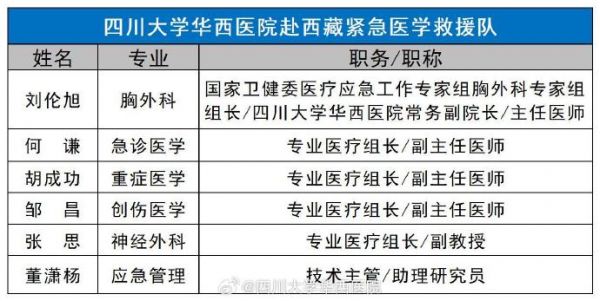 據(jù)醫(yī)院消息,接國家衛(wèi)健委醫(yī)療應(yīng)急司緊急指令后,四川大學(xué)華西醫(yī)院迅速抽調(diào)中國國際應(yīng)急醫(yī)療隊(四川)/國家衛(wèi)生應(yīng)急移動醫(yī)療救治中心(四川大學(xué)華西醫(yī)院)組建緊急醫(yī)學(xué)救援隊,于下午 14 點出發(fā)馳援西藏,對地震傷員開展指導(dǎo)救治工作。專家組共 6 人,涵蓋胸外、急診、重癥、創(chuàng)傷、神經(jīng)外科等領(lǐng)域。