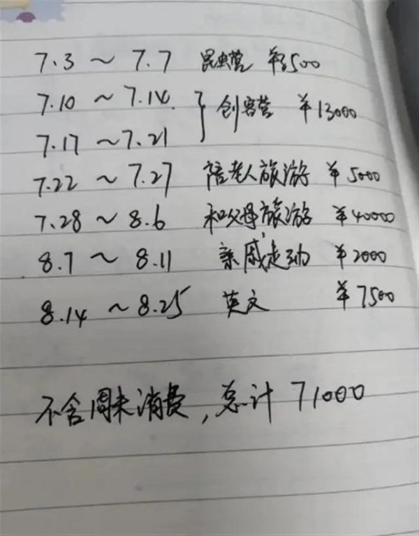 看看這位家長的暑假賬單,40天花了71000元,不含周末消費(fèi),家長要對假期的消費(fèi)需求要有點(diǎn)兒心理準(zhǔn)備啊,量力而行,不然錢包會掏空。