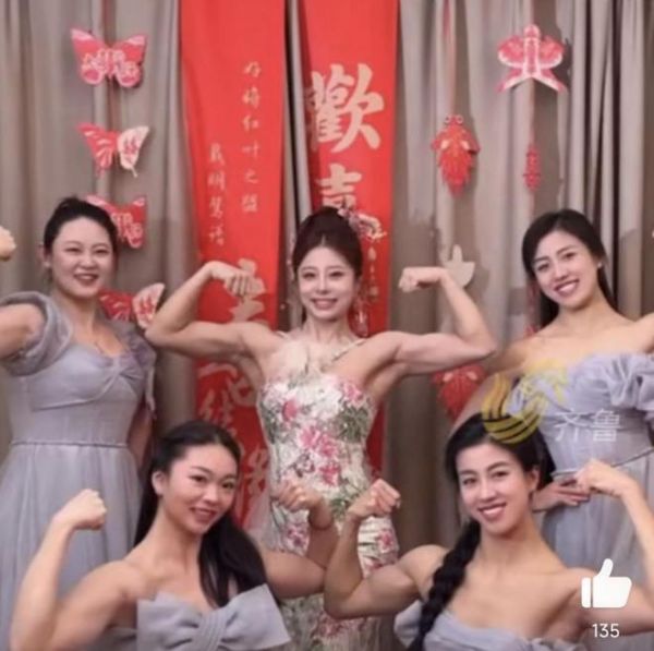 在婚禮現(xiàn)場,新娘與伴娘們都身著盛裝,還展現(xiàn)了自己的健美專業(yè)能力和超強(qiáng)肌肉,自信與風(fēng)采,令人贊嘆不已。