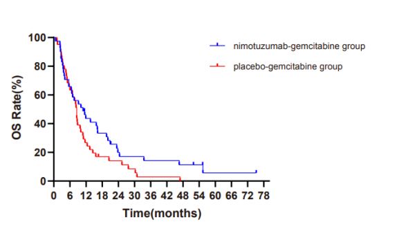 NOTABLE研究是一項(xiàng)前瞻性、隨機(jī)雙盲、陽性藥平行對照、全國多中心的關(guān)鍵性III期臨床研究,創(chuàng)新性地采用分子生物標(biāo)志物篩選富集人群。從2015年4月至2020年9月,歷時(shí)5年時(shí)間,共25家大型中心共同參與,篩選了480例,隨機(jī)入組92例K-Ras基因野生型的局部晚期或轉(zhuǎn)移性胰腺癌患者。以1:1隨機(jī)分為兩組,試驗(yàn)組接受尼妥珠單抗(400mg,每周1次)+吉西他濱( 1000mg/m2,第1、8、15天,每4周1個(gè)療程),直至疾病進(jìn)展或發(fā)生無法耐受的不良事件,對照組接受安慰劑+吉西他濱。主要研究終點(diǎn)為總生存期(OS),關(guān)鍵次要終點(diǎn)為無進(jìn)展生存期(PFS),其他次要終點(diǎn)包括客觀緩解率(ORR)、疾病進(jìn)展時(shí)間(TTP)和安全性等。