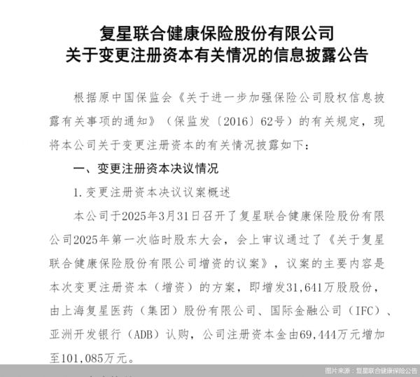 根據(jù)復(fù)星聯(lián)合健康保險(xiǎn)公告,該公司于3月31日召開(kāi)了2025年第一次臨時(shí)股東大會(huì),會(huì)上審議通過(guò)了《關(guān)于復(fù)星聯(lián)合健康保險(xiǎn)股份有限公司增資的議案》,議案的主要內(nèi)容是變更注冊(cè)資本(增資)的方案。