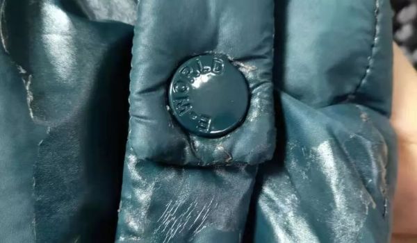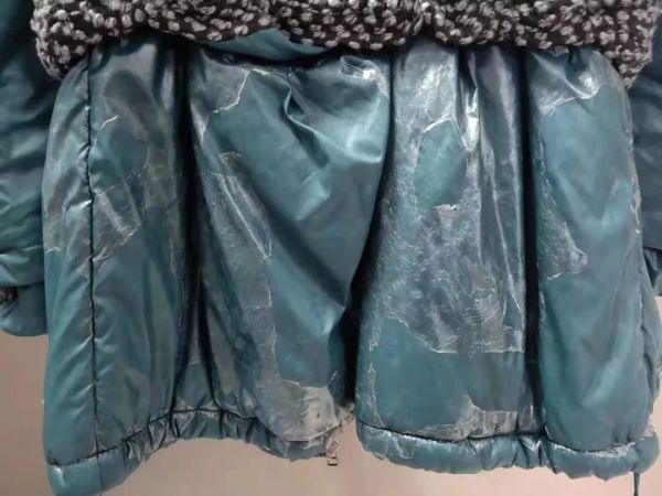 洗滌此類衣物時(shí),必須注意衣物購(gòu)買(mǎi)時(shí)間,時(shí)間越久衣物風(fēng)險(xiǎn)越高,涂層越是容易脫離。收衣時(shí)必須與顧客講清楚說(shuō)明白,還有衣物在磨損部位,如領(lǐng)口兜口袖口下擺等主要位置,容易出現(xiàn)涂層提前脫離現(xiàn)象,收衣預(yù)先說(shuō)明給顧客。洗滌時(shí)此類衣物,盡量手工操作為主,機(jī)器洗滌不可控制最容易導(dǎo)致覆膜脫離。杜絕高溫、禁止機(jī)械力、減輕助劑量、避免機(jī)械烘干,是有效避免涂層覆膜溶解脫離事故!
