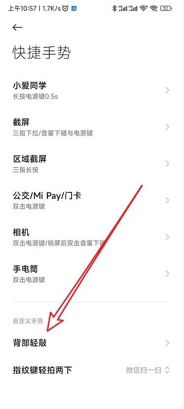 這時(shí)就可以打開紅米K40手機(jī)的快捷手勢(shì)設(shè)置頁(yè)面了,在頁(yè)面中找到并點(diǎn)擊“背部輕敲”的菜單項(xiàng)。