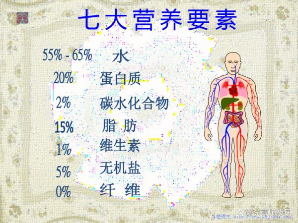 那通過學(xué)習(xí)我們知道了,人體的本質(zhì)達(dá)到最小單位是細(xì)胞,細(xì)胞組成各種組織,組織又組成了器官,器官組成了系統(tǒng),總之人體的本質(zhì)里里外外都是有細(xì)胞組成的。而組成細(xì)胞的物質(zhì),書里管它叫元素,人體細(xì)胞里包括了七大元素,也就是說人是由七大元素組成,其中包括,蛋白質(zhì),碳水化合物,脂肪,維生素,礦物質(zhì),水,纖維素。我們也可以管它們叫做;人體七大營(yíng)養(yǎng)元素