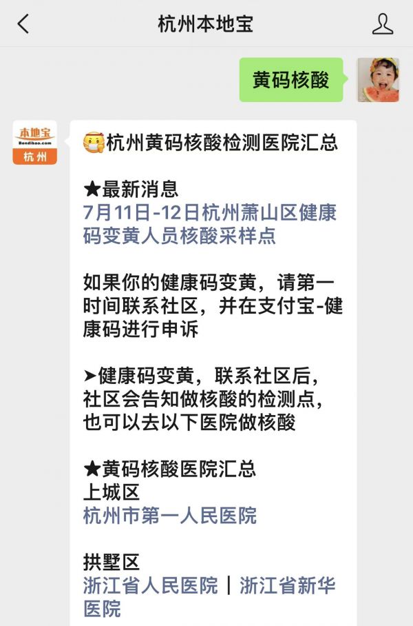 溫馨提示:搜索并關(guān)注微信公眾號(hào)杭州本地寶,回復(fù)【黃碼核酸】查詢杭州健康碼黃碼哪里可以做核酸檢測(cè),以及近期蕭山黃碼去哪里做核酸等內(nèi)容。