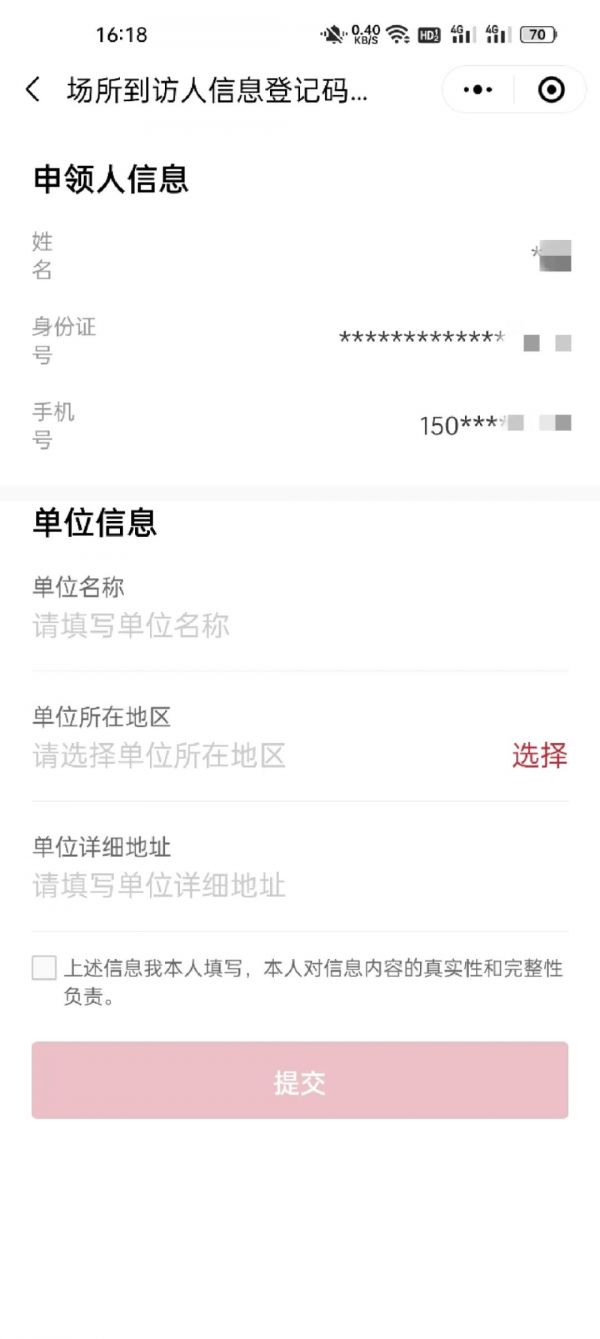 打開“國家政務平臺”微信小程序→點擊“防疫健康碼服務”→點擊“立即申領/您已申領,立即查看”→點擊“場所到訪人信息登記碼申領”→點擊“同意”→填寫申領人相關信息→勾選“協(xié)議”同意按鈕→完成步驟,生成二維碼,按要求張貼在醒目位置。