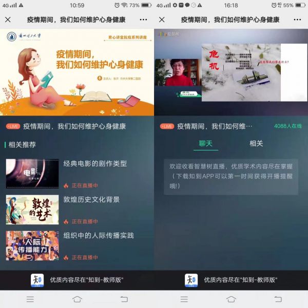 為切實做好疫情期間的心理健康工作,確保我校師生平穩(wěn)度過特殊時期,校團(tuán)委、心理健康指導(dǎo)服務(wù)中心開設(shè)育心講堂“愛在深秋”系列抗疫講座,11月9日下午第五場特邀蘭州大學(xué)教授、蘭州大學(xué)第二醫(yī)院心理衛(wèi)生科主任張?zhí)m老師做了主題為《疫情期間,我們?nèi)绾尉S護(hù)心身健康》的專題講座,共計4262人收看講座,講座由校團(tuán)委副書記王文霞主持。
