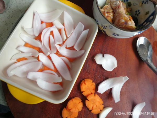 3.取一個(gè)烤盤,底下鋪一層胡蘿卜片,再鋪一層洋蔥片,然后把雞翅根放在上面。