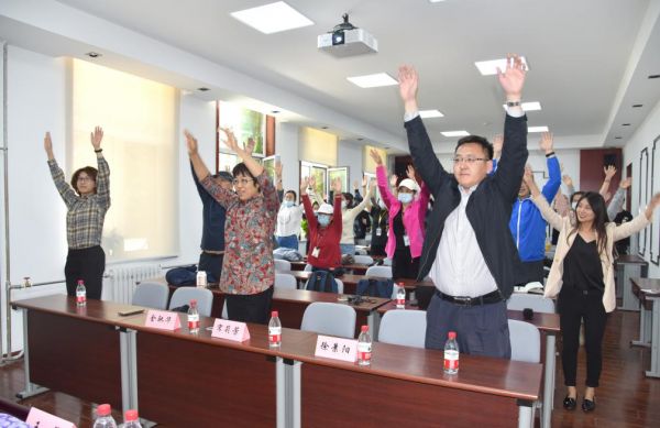 隨后,王勇帶領(lǐng)全場教職工跟隨音樂的律動進行熱身活動,為大家?guī)砹艘粓鲫P(guān)于《健康生命的自我維護》的精彩講授。