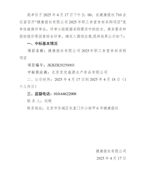 健康報社有限公司2025年職工食堂食材采購項目競爭性磋商中標結(jié)果