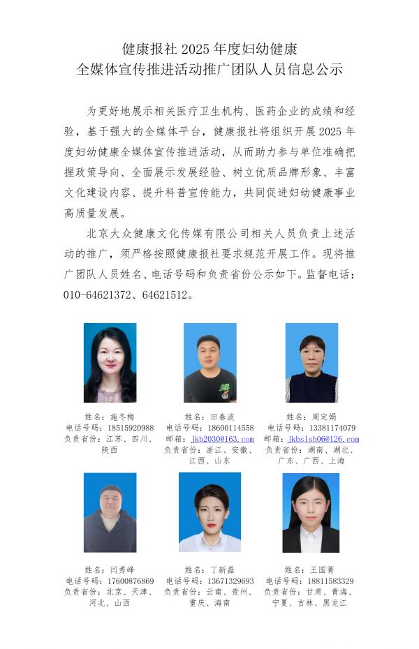 健康報社2025年度婦幼健康全媒體宣傳推進活動推廣團隊人員信息公示