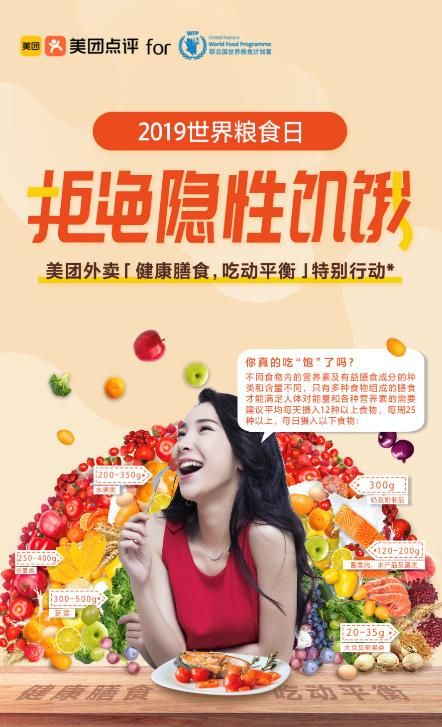 10月16日,是第39個(gè)世界糧食日,在"行動(dòng)造就未來(lái)-健康飲食實(shí)現(xiàn)零饑餓"的全球主題下,美團(tuán)與聯(lián)合國(guó)世界糧食計(jì)劃署共推"拒絕隱性饑餓"健康飲食倡導(dǎo)行動(dòng)。在"拒絕隱性饑餓"健康飲食倡導(dǎo)行動(dòng)中,美團(tuán)外賣發(fā)起"健康膳食,吃動(dòng)平衡"特別行動(dòng),通過(guò)四大舉措,提倡"健康膳食"的健康飲食理念,倡導(dǎo)"吃動(dòng)平衡"的健康生活方式。
