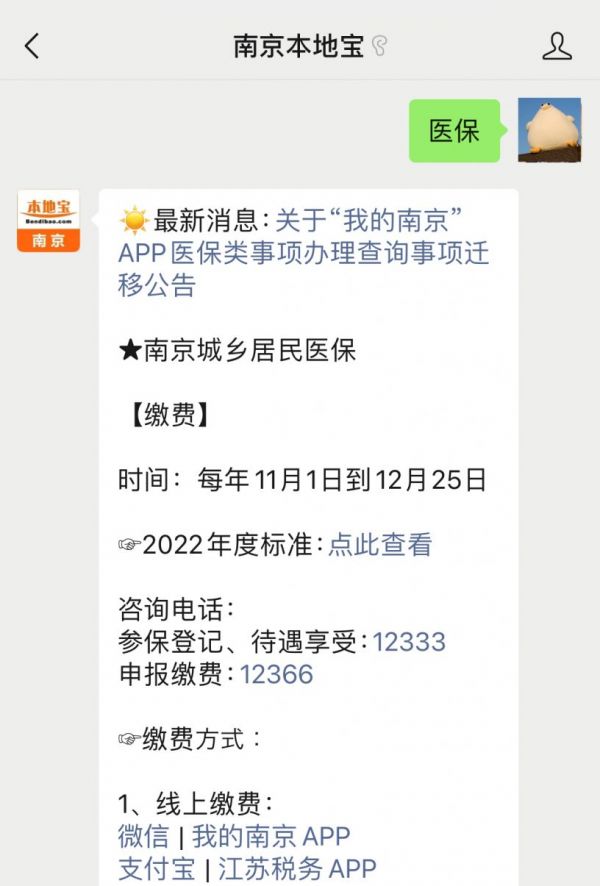 溫馨提示:微信搜索公眾號南京本地寶,關(guān)注后在對話框回復(fù)【醫(yī)保】查詢南京各類人群醫(yī)保參保、繳費(fèi)、續(xù)保及相關(guān)問答等信息。