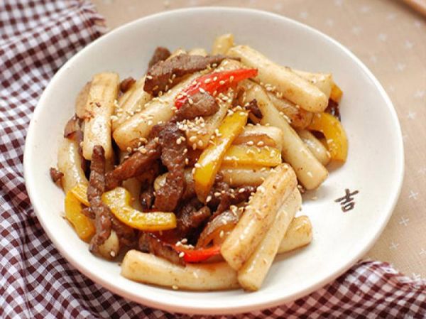 材料:牛里脊肉100克,年糕200克,洋蔥、青椒、胡蘿卜、生抽、料酒、鹽、糖、淀粉、蔥、姜、蒜、老抽、蠔油、香油適量。