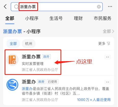 在搜索框內(nèi)搜索【浙里辦票】,點(diǎn)擊如下圖所示的區(qū)域進(jìn)入頁面發(fā)票展示頁面