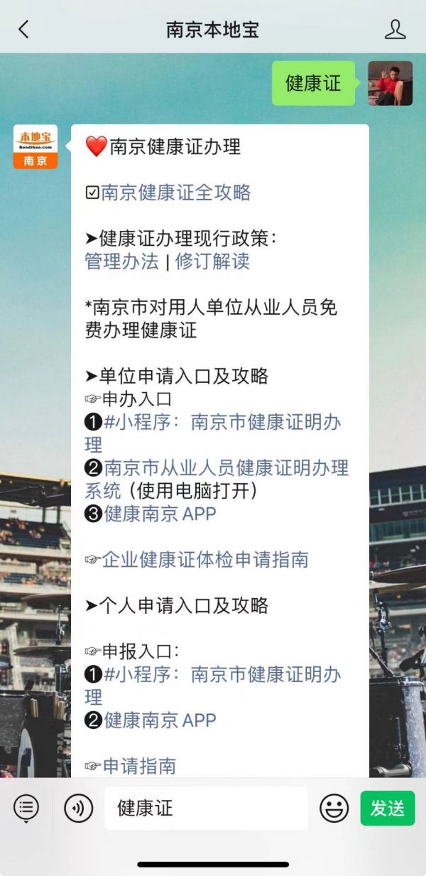 溫馨提示:微信搜索公眾號【南京本地寶】,關(guān)注后在對話框回復(fù)【健康證】可獲取南京單位及個人健康證申報入口(多個)、健康證免費辦理規(guī)定、電子健康證查詢及打印、體檢地點及咨詢電話等消息。