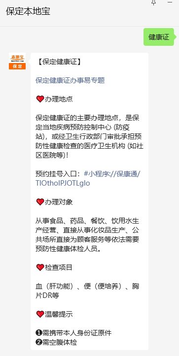 溫馨提示:微信搜索公眾號【保定本地寶】,關(guān)注后在對話框回復(fù)【健康證】可獲保定健康證辦理指南(辦理地點+材料+項目)、檢查項目、辦證人群、醫(yī)院預(yù)約掛號等信息