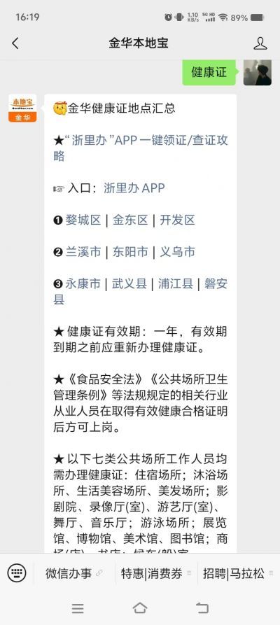 溫馨提示:微信搜索金華本地寶,關注后在聊天對話框回復【健康證】即可獲取金華市健康證辦理預約入口、辦理指南、辦理地址、咨詢電話、常見問題等。