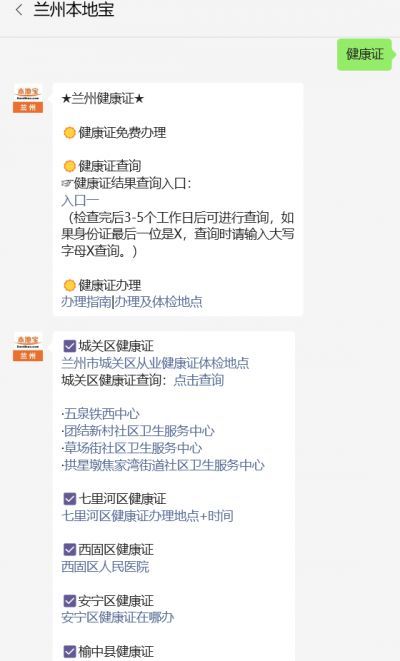 溫馨提示:微信搜索公眾號【蘭州本地寶】,關(guān)注后在對話框回復(fù)【健康證】可獲蘭州健康證辦理機構(gòu)名單、電子版在線查詢、辦理時間+所需證件+辦理流程等。