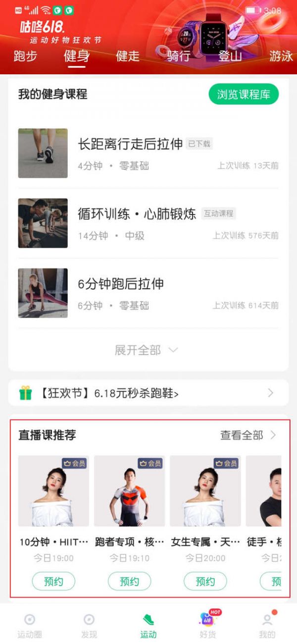 1.【運動】-【健身】-【直播課推薦】-一鍵預約