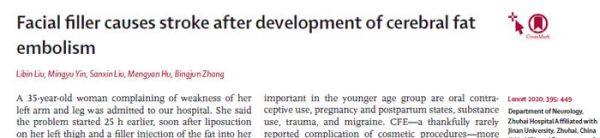 日前,珠海市人民醫(yī)院神經(jīng)內(nèi)科劉禮斌副主任醫(yī)師作為第一作者(通訊作者為中山大學附屬第三醫(yī)院張炳俊)在國際頂級醫(yī)學期刊Lancet(柳葉刀,IF 59.1)發(fā)表題為“Facial filler causes stroke after development of cerebral fat embolism”(面部填充物導(dǎo)致脂肪栓塞性腦卒中)的病例報道,詳細介紹了一位脂肪栓塞性腦卒中患者的診治過程及經(jīng)驗。