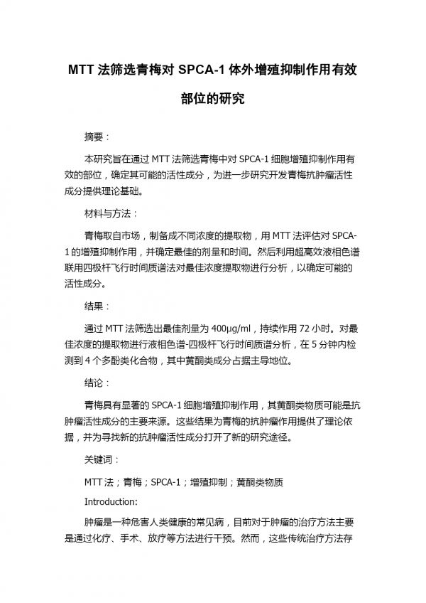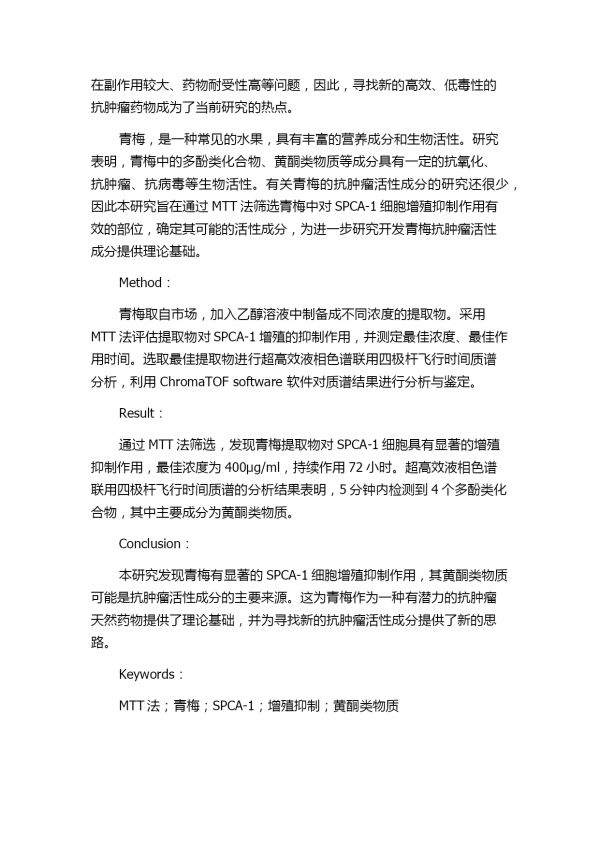 MTT法篩選青梅對(duì)SPCA-1體外增殖抑制作用有效部位的研究 摘要: 本研究旨在通過(guò)MTT法篩選青梅中對(duì)SPCA-1細(xì)胞增殖抑制作用有效的部位,確定其可能的活性成分,為進(jìn)一步研究開(kāi)發(fā)青梅抗腫瘤活性成分提供理論基礎(chǔ)。 材料與方法: 青梅取自市場(chǎng),制備成不同濃度的提取物,用MTT法評(píng)估對(duì)SPCA-1的增殖抑制作用,并確定最佳的劑量和時(shí)間。然后利用超高效液相色譜聯(lián)用四極桿飛行時(shí)間質(zhì)譜法對(duì)最佳濃度提取物進(jìn)行分析,以確定可能的活性成分。 結(jié)果: 通過(guò)MTT法篩選出最佳劑量為400μg/ml,持續(xù)作用72小時(shí)。對(duì)最佳濃度的提取物進(jìn)行液相色譜-四極桿飛行時(shí)間質(zhì)譜分析,在5分鐘內(nèi)檢測(cè)到4個(gè)多酚類(lèi)化合物,其中黃酮類(lèi)成分占據(jù)主導(dǎo)地位。 結(jié)論: 青梅具有顯著的SPCA-1細(xì)胞增殖抑制作用,其黃酮類(lèi)物質(zhì)可能是抗腫瘤活性成分的主要來(lái)源。這些結(jié)果為青梅的抗腫瘤作用提供了理論依據(jù),并為尋找新的抗腫瘤活性成分打開(kāi)了新的研究途徑。 關(guān)鍵詞: MTT法;青梅;SPCA-1;增殖抑制;黃酮類(lèi)物質(zhì) Introduction: 腫瘤是一種危害人類(lèi)健康的常見(jiàn)病,目前對(duì)于腫瘤的治療方法主要是通過(guò)化療、手術(shù)、放療等方法進(jìn)行干預(yù)。然而,這些傳統(tǒng)治療方法存在副作用較大、藥物耐受性高等問(wèn)題,因此,尋找新的高效、低毒性的抗腫瘤藥物成為了當(dāng)前研究的熱點(diǎn)。 青梅,是一種常見(jiàn)的水果,具有豐富的營(yíng)養(yǎng)成分和生物活性。研究表明,青梅中的多酚類(lèi)化合物、黃酮類(lèi)物質(zhì)等成分具有一定的抗氧化、抗腫瘤、抗病毒等生物活性。有關(guān)青梅的抗腫瘤活性成分的研究還很少,因此本研究旨在通過(guò)MTT法篩選青梅中對(duì)SPCA-1細(xì)胞增殖抑制作用有效的部位,確定其可能的活性成分,為進(jìn)一步研究開(kāi)發(fā)青梅抗腫瘤活性成分提供理論基礎(chǔ)。 Method: 青梅取自市場(chǎng),加入乙醇溶液中制備成不同濃度的提取物。采用MTT法評(píng)估提取物對(duì)SPCA-1增殖的抑制作用,并測(cè)定最佳濃度、最佳作用時(shí)間。選取最佳提取物進(jìn)行超高效液相色譜聯(lián)用四極桿飛行時(shí)間質(zhì)譜分析,利用ChromaTOFsoftware軟件對(duì)質(zhì)譜結(jié)果進(jìn)行分析與鑒定。 Result: 通過(guò)MTT法篩選,發(fā)現(xiàn)青梅提取物對(duì)SPCA-1細(xì)胞具有顯著的增殖抑制作用,最佳濃度為400μg/ml,持續(xù)作用72小時(shí)。超高效液相色譜聯(lián)用四極桿飛行時(shí)間質(zhì)譜的分析結(jié)果表明,5分鐘內(nèi)檢測(cè)到4個(gè)多酚類(lèi)化合物,其中主要成分為黃酮類(lèi)物質(zhì)。 Conclusion: 本研究發(fā)現(xiàn)青梅有顯著的SPCA-1細(xì)胞增殖抑制作用,其黃酮類(lèi)物質(zhì)可能是抗腫瘤活性成分的主要來(lái)源。這為青梅作為一種有潛力的抗腫瘤天然藥物提供了理論基礎(chǔ),并為尋找新的抗腫瘤活性成分提供了新的思路。 Keywords: MTT法;青梅;SPCA-1;增殖抑制;黃酮類(lèi)物質(zhì)