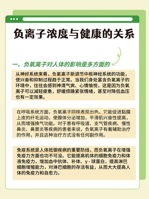 從神經(jīng)系統(tǒng)來(lái)看,負(fù)氧離子能調(diào)節(jié)中樞神經(jīng)系統(tǒng)的功能,使興奮和抑制過(guò)程趨于正常。當(dāng)我們身處富含負(fù)氧離子的環(huán)境中,往往會(huì)感到神清氣爽、心情愉悅,這是因?yàn)樨?fù)氧離子可以減輕疲憊,舒緩煩躁緊張情緒,甚至對(duì)降低血壓也有一定效果。