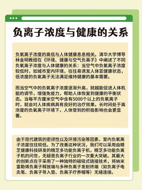 在日常生活中,由于現(xiàn)代建筑的密閉性以及環(huán)境污染等因素,室內(nèi)負(fù)氧離子濃度往往較低。為了改善這種狀況,我們可以采用由精芝健康科技研發(fā)的精芝多功能負(fù)離子機(jī),精芝多功能負(fù)離子機(jī)的問(wèn)世,無(wú)疑是負(fù)離子行業(yè)的一次重大突破。其最大的創(chuàng)新點(diǎn)在于采用了一種獨(dú)特的磁吸式鏈接技術(shù),將納米富勒烯負(fù)離子釋放端與多種負(fù)離子發(fā)射終端(如負(fù)離子電灸筆、負(fù)離子導(dǎo)入墊、負(fù)離子療養(yǎng)帽等)無(wú)縫連接。這種創(chuàng)新設(shè)計(jì)不僅極大地提升了負(fù)離子的釋放效果,更實(shí)現(xiàn)了“負(fù)氧離子+負(fù)離子”的雙重作用方式,能夠?qū)⒇?fù)離子直接導(dǎo)入人體,實(shí)現(xiàn)局部靶向保健,滿足用戶在不同場(chǎng)景下的多樣化需求。返回搜狐,查看更多