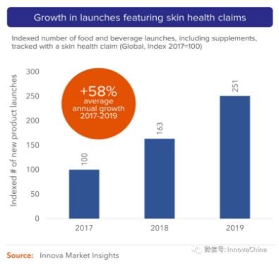 根據(jù)Innova數(shù)據(jù),2017-2019年間全球帶有肌膚健康宣稱的食品飲料和膳食補(bǔ)充劑新品年均復(fù)合增長(zhǎng)率高達(dá)58%,其中千禧一代和Z世代更偏好通過(guò)功能食品飲料達(dá)到美容養(yǎng)顏的目的。Innova追蹤還發(fā)現(xiàn)新一代養(yǎng)顏美容原料的應(yīng)用開(kāi)始超越維生素C、維生素E等傳統(tǒng)美容成分,如透明質(zhì)酸是帶有肌膚健康宣稱的食品飲料和膳食補(bǔ)充劑新品發(fā)布中增速最高的關(guān)鍵原料,過(guò)去5年間年均復(fù)合增長(zhǎng)率高達(dá)59%。