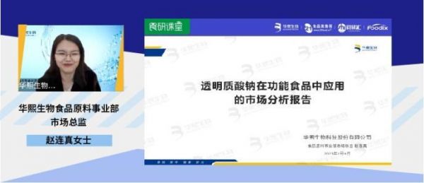 發(fā)布會(huì)上,華熙生物功能食品基礎(chǔ)研究中心主任張?zhí)烀炔┦亢腿A熙生物食品原料事業(yè)部市場(chǎng)總監(jiān)趙連真女士分別向大家展示了華熙生物近年來(lái)在透明質(zhì)酸食品領(lǐng)域的最新成果及透明質(zhì)酸鈉在全球功能食品領(lǐng)域的應(yīng)用現(xiàn)狀,為品牌探索透明質(zhì)酸鈉健康食品的應(yīng)用場(chǎng)景提供市場(chǎng)依據(jù)和借鑒。