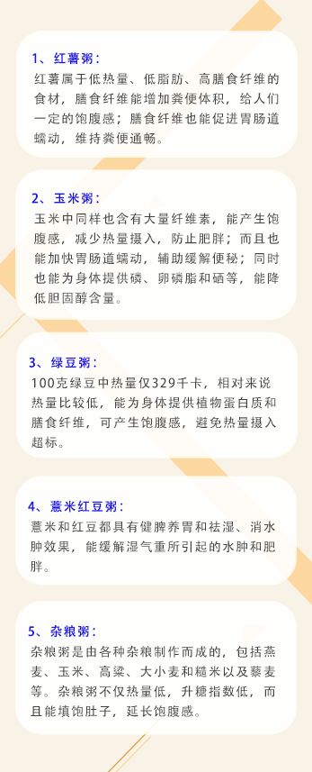 紅薯粥、玉米粥、綠豆粥、紅豆薏米粥、雜糧等都能輔助減肥。