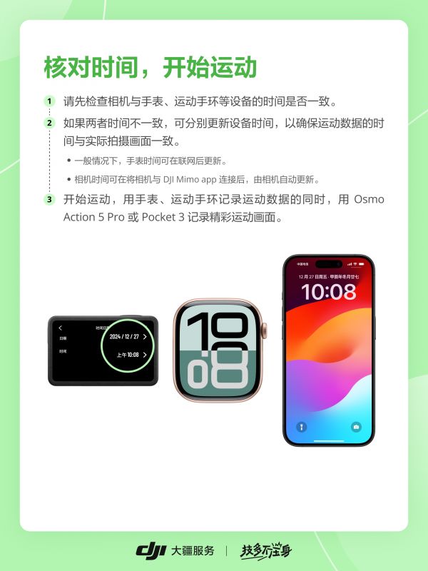 ① 運(yùn)動(dòng)開始前檢查:檢查相機(jī)與您的手表/碼表等設(shè)備的時(shí)間是否一致。如果兩者時(shí)間不一致,將設(shè)備聯(lián)網(wǎng)更新時(shí)間,相機(jī)連接 DJI Mimo app 更新相機(jī)的時(shí)間,以確保運(yùn)動(dòng)數(shù)據(jù)的記錄時(shí)間與實(shí)際拍攝畫面時(shí)間一致。