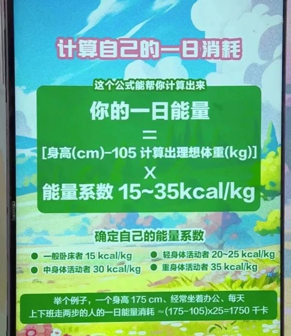 一般來說,根據(jù)身高(cm)-105 計(jì)算出理想體重(kg),再乘能量系數(shù)15~35kcal/kg,就能計(jì)算出成人個(gè)體化的一天消耗(一般臥床者15kcal/kg、輕身體活動(dòng)者20~25kcal/kg、中身體活動(dòng)者30kcal/kg、重身體活動(dòng)者35kcal/kg)。
