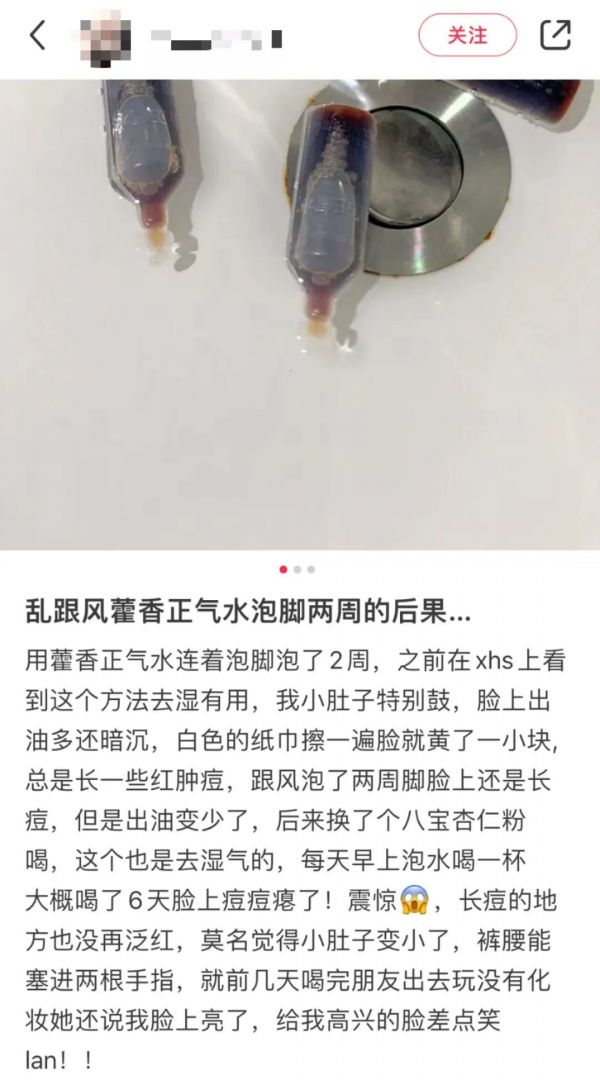 有網(wǎng)友“跟風(fēng)”藿香正氣水泡腳。她表示,自己小肚子特別鼓,臉上出油多還暗沉,白色的紙巾擦一遍臉就黃了一小塊,還總是長一些紅腫痘痘?!案L(fēng)泡了兩周腳,臉上還是長痘,但是出油變少了。”配合喝了八寶杏仁粉,網(wǎng)友覺得自己小肚子變小了,笑稱“褲腰能塞進兩根手指”。