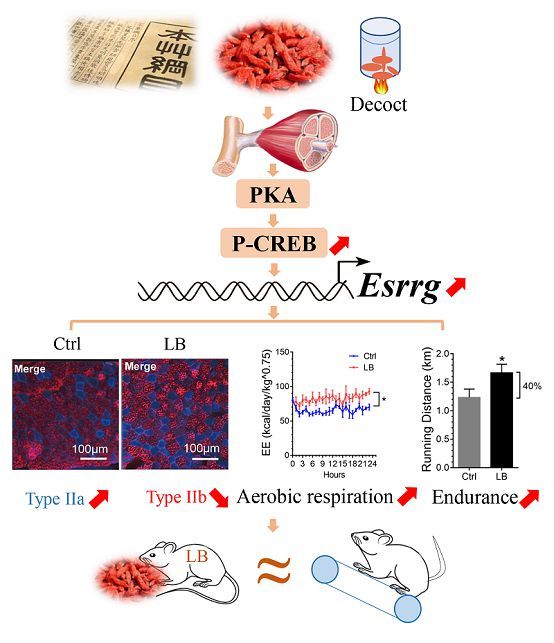 利用現(xiàn)代科學(xué)技術(shù)手段和思路對枸杞"堅筋骨"這一功效進行了科學(xué)解讀,發(fā)現(xiàn)枸杞水提物通過激活PKA-CREB通路上調(diào)ERRγ(基因名為Esrrg),從而調(diào)控肌纖維類型"模擬鍛煉"增強肌肉功能。