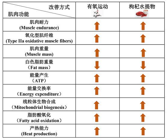 這項研究首次證明,枸杞水提物可以調(diào)節(jié)骨骼肌重塑和能量代謝,為枸杞"堅筋骨"的傳統(tǒng)功效提供了科學(xué)解讀。在增強肌肉耐力、增加氧化型肌纖維比例、增加肌肉體重比、減少白色脂肪含量、增加能量產(chǎn)生和能量交換、促進線粒體生物合成、促進脂肪酸氧化和產(chǎn)熱方面均起到模擬鍛煉的效果 (表1)。