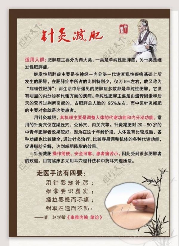 2、可以促進能量的代謝,增加能量消耗,促進體脂的動員及脂肪分解,最終實現(xiàn)其減肥效果 。針灸減肥時有可能針對手三里穴,三陰交穴,風(fēng)市穴,中瀆穴進行治療。