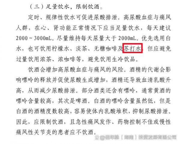 同時,發(fā)布的內容中《成人高尿酸血癥與痛風食飲指南》也指出,要足量飲水,限制飲酒,建議優(yōu)先選擇無糖無添加的白水,蘇打水更佳。(注意這里指的蘇打水并非市面常見的蘇打水飲料,而是含碳酸氫鈉的天然蘇打水)