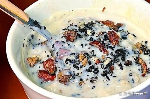 ② 關(guān)火后拌入核桃碎、黑芝麻粉,藍(lán)莓點(diǎn)綴。