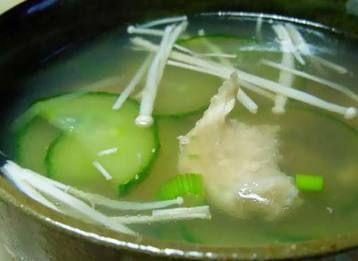 做法:大黃瓜削皮切片、鮑魚菇、香菇切條、與金針菇加適量調(diào)味料烹煮,再加一些香菜。