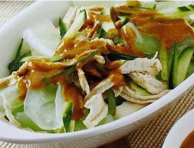 3、將粉皮放在開水里燙一下,再用冷開水過一過,然后將粉皮放在盤底,粉皮上面放雞絲,雞絲上面放黃瓜絲,再澆上一絲用香醋,醬油,味精,麻油調(diào)成的味汁即可,上桌時,另跟芥末。
